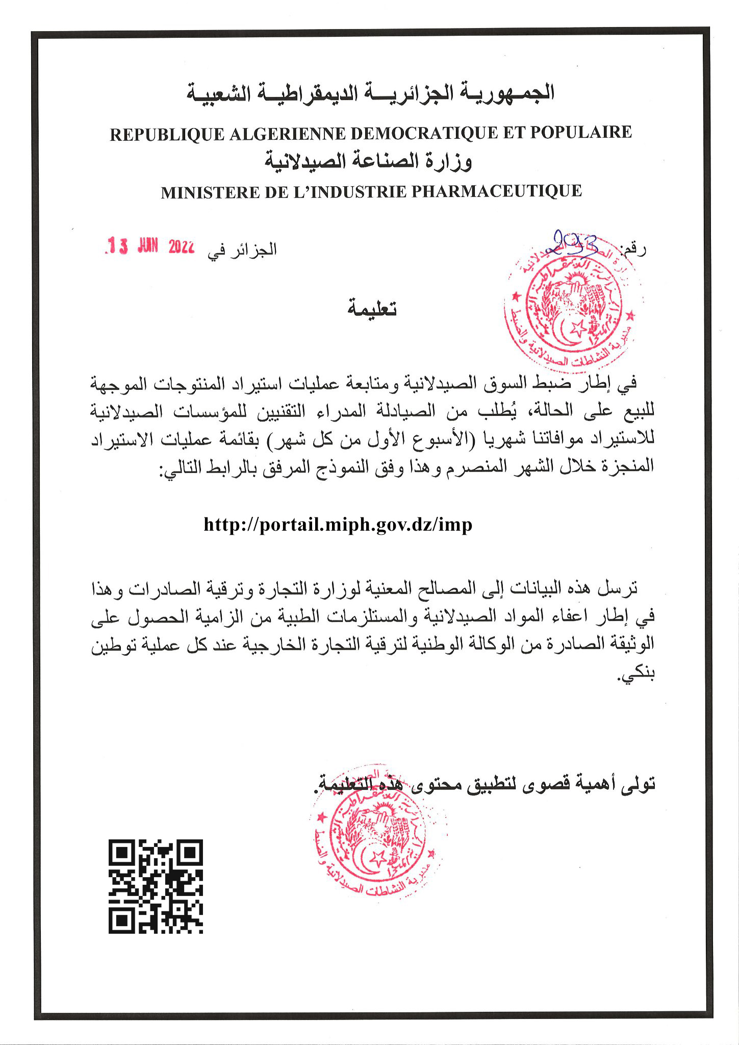 تعليمة للمؤسسات الصيدلانية -قائمة عمليات الاستيراد La rédaction 13 يونيو 2022 No comments التصريح الشهري بعمليات الاستيراد المنجزة