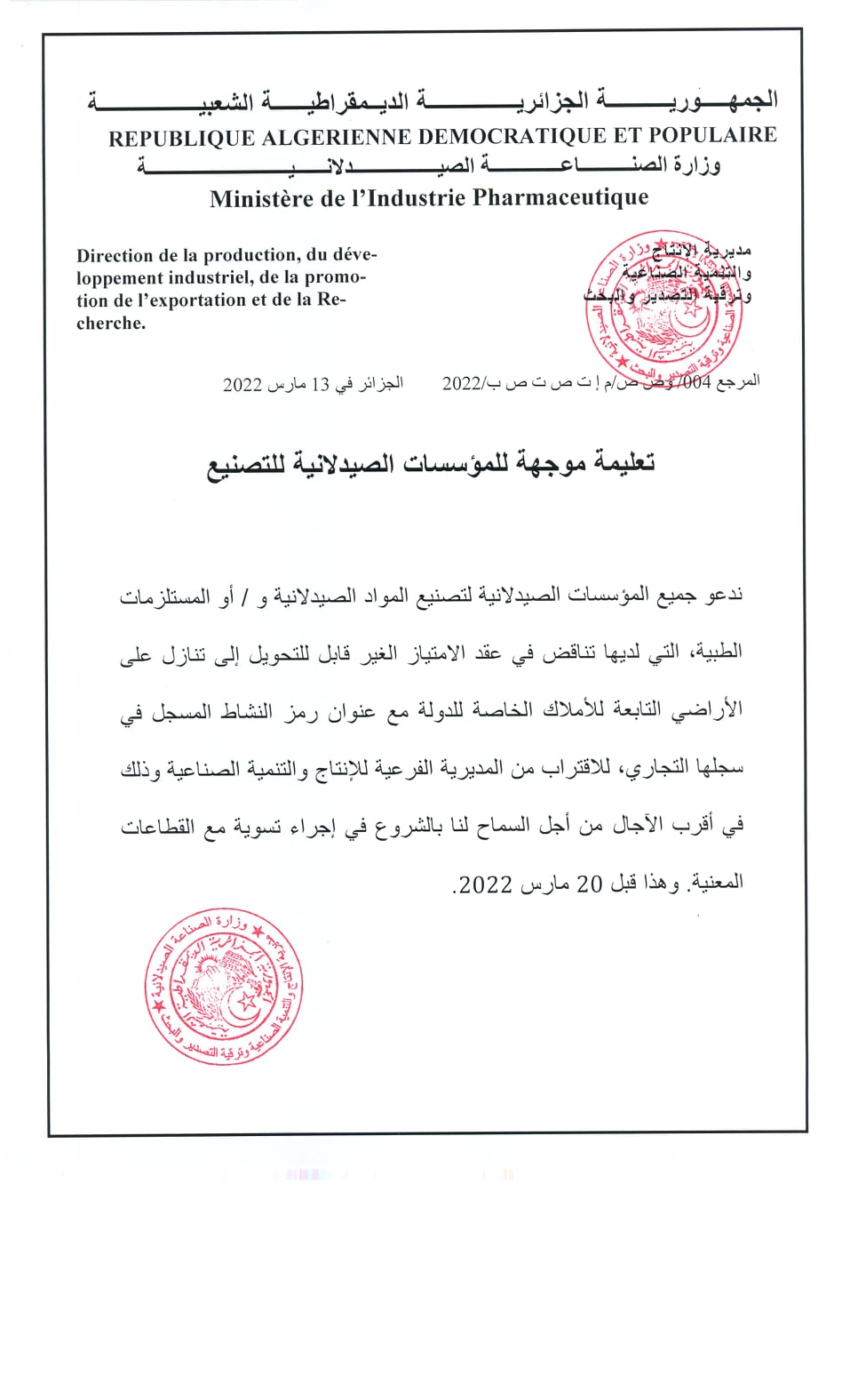 • تعليمة موجهة للمؤسسات الصيدلانية للتصنيع