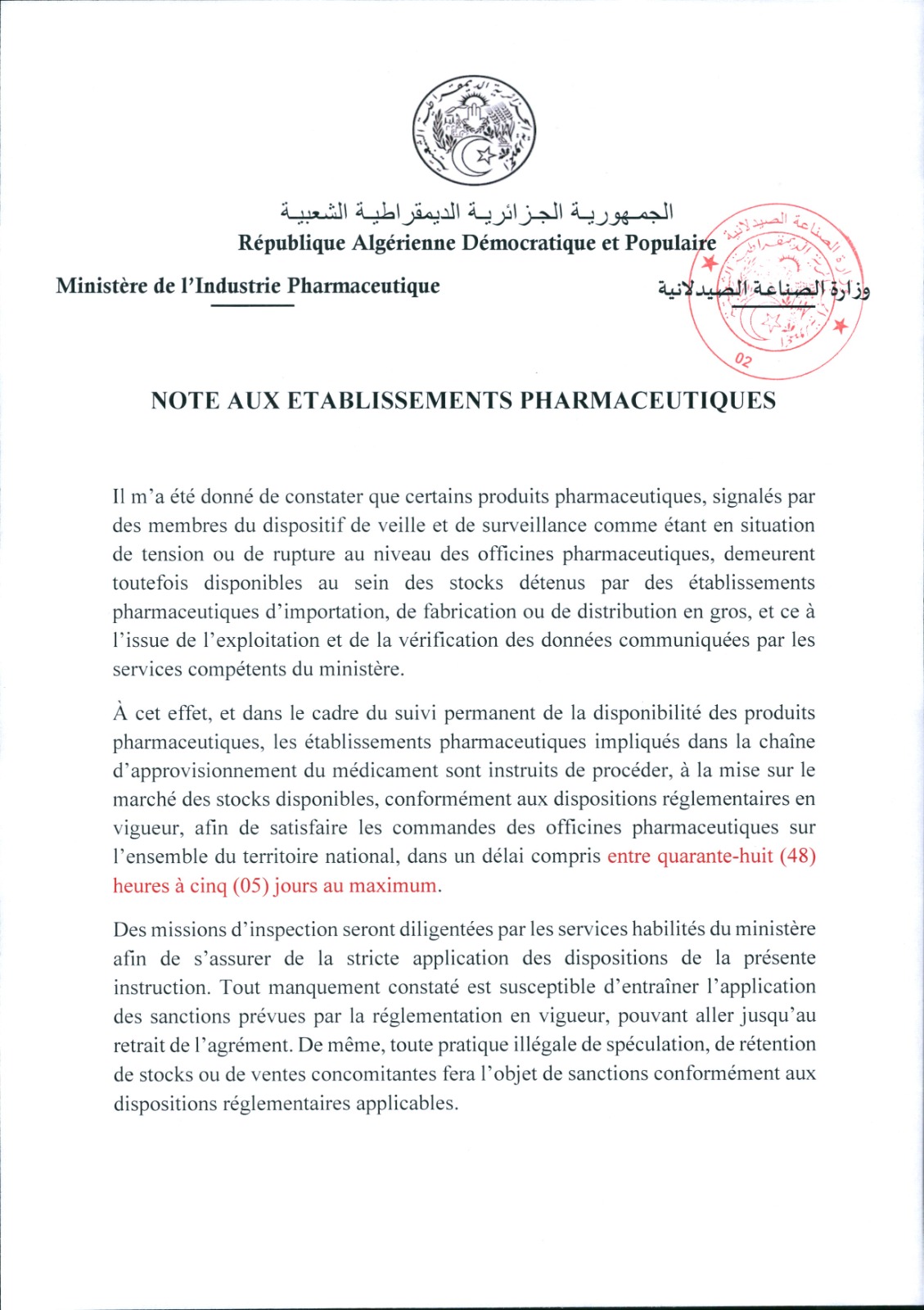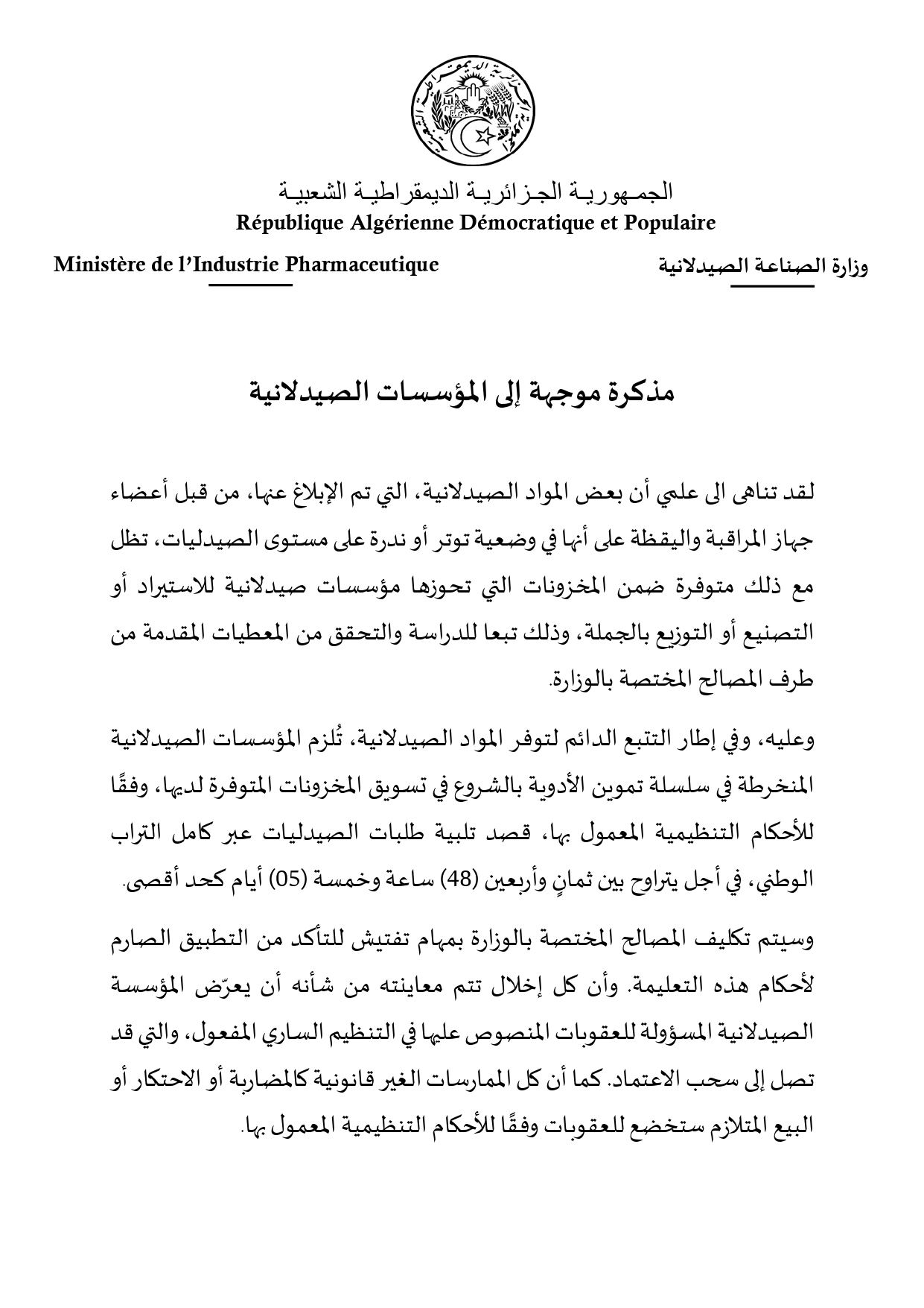 تعليمة موجهة الى كافة المؤسسات الصيدلانية
