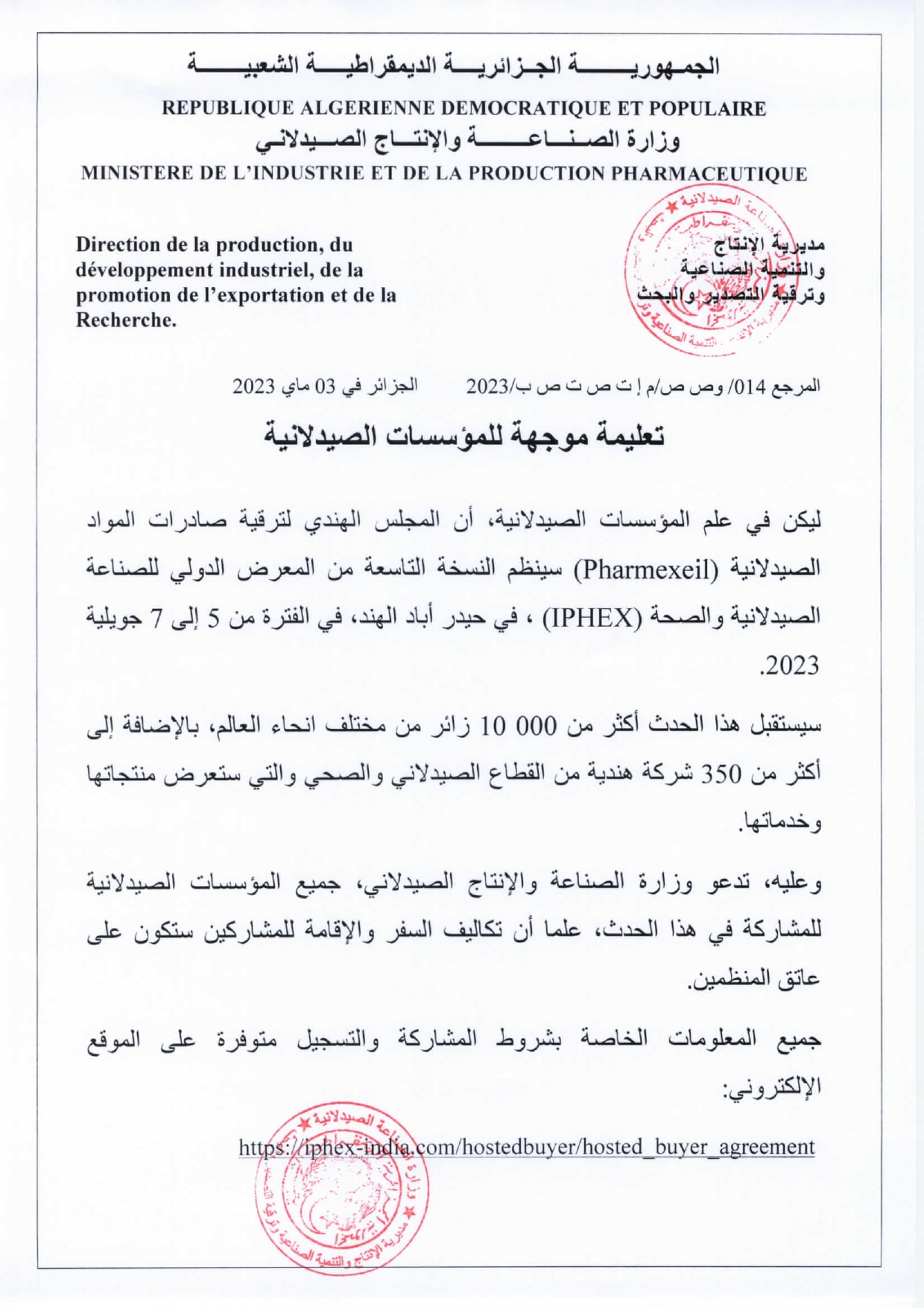تعليمة موجهة للمؤسسات الصيدلانية- المشاركة في النسخة التاسعة للمعرض الدولي للصناعة الصيدلانية و الصحة IPHEX