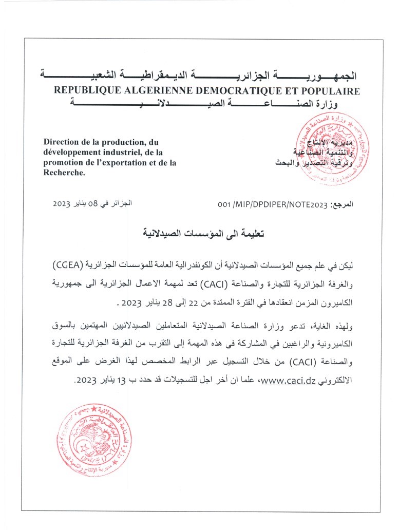 تعليمة موجهة للمؤسسات الصيدلانية- بعثة رجال أعمال جزائريين إلى الكاميرون ghorab 8 يناير 2023 No comments المزيد من المعلومات