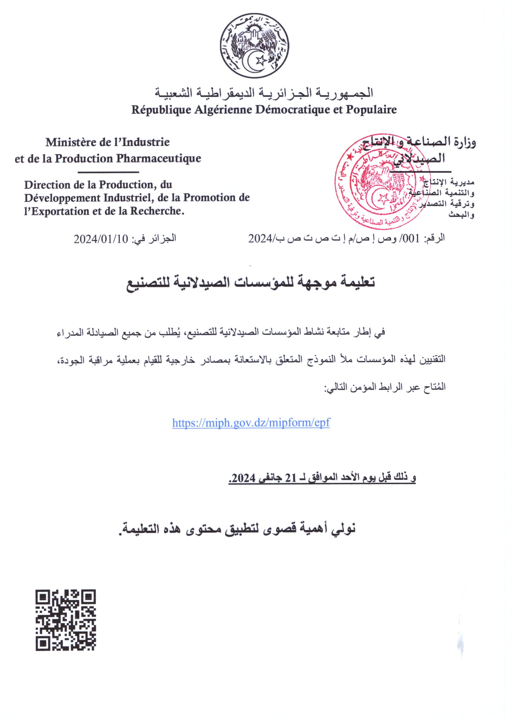 • تعليمة موجهة للمؤسسات الصيدلانية للتصنيع