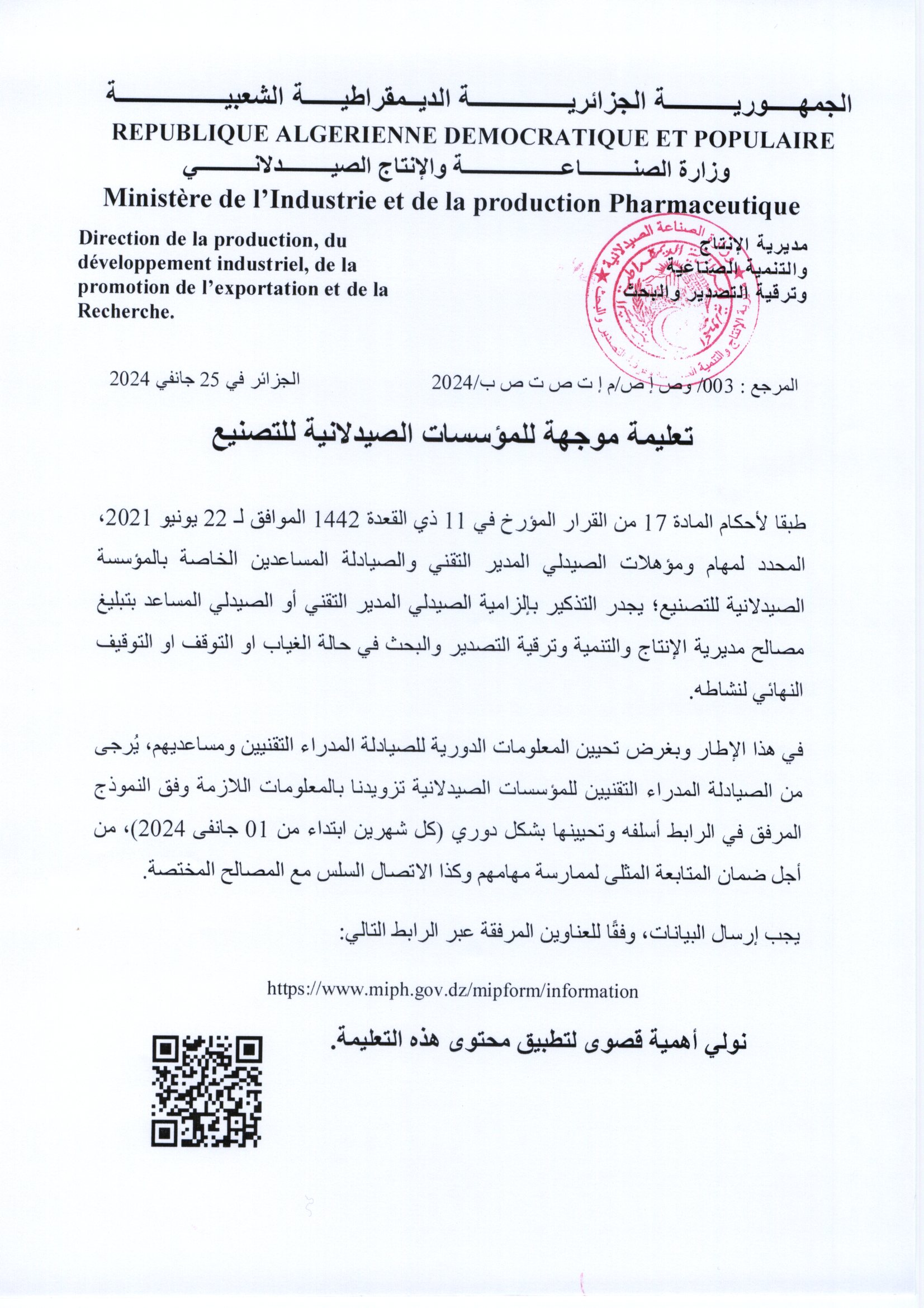 • تعليمة موجهة للمؤسسات الصيدلانية للتصنيع