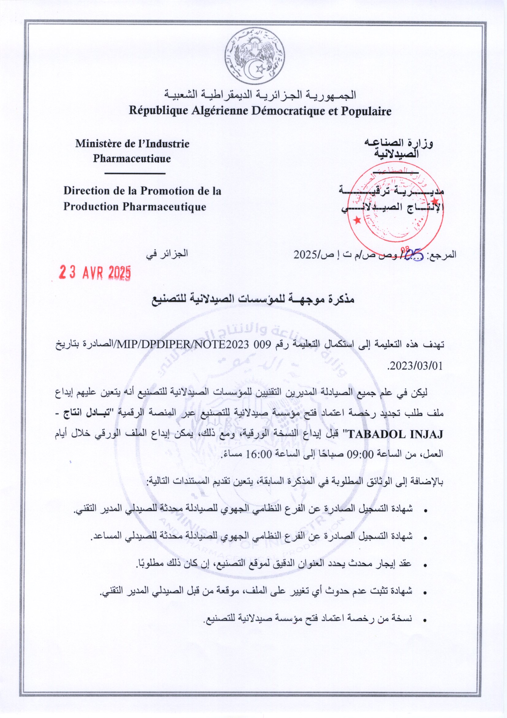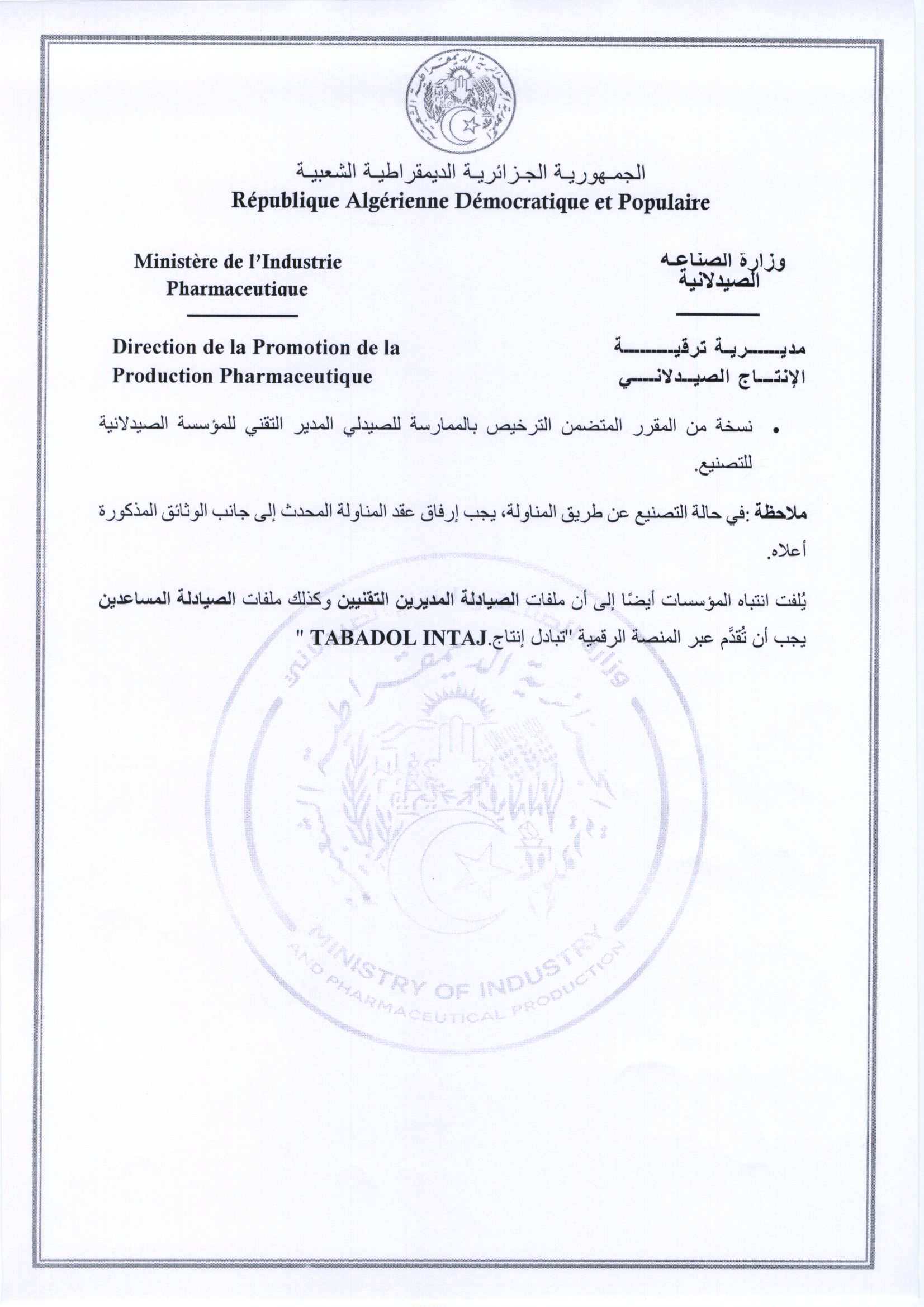 • تعليمة موجهة للمؤسسات الصيدلانية للتصنيع