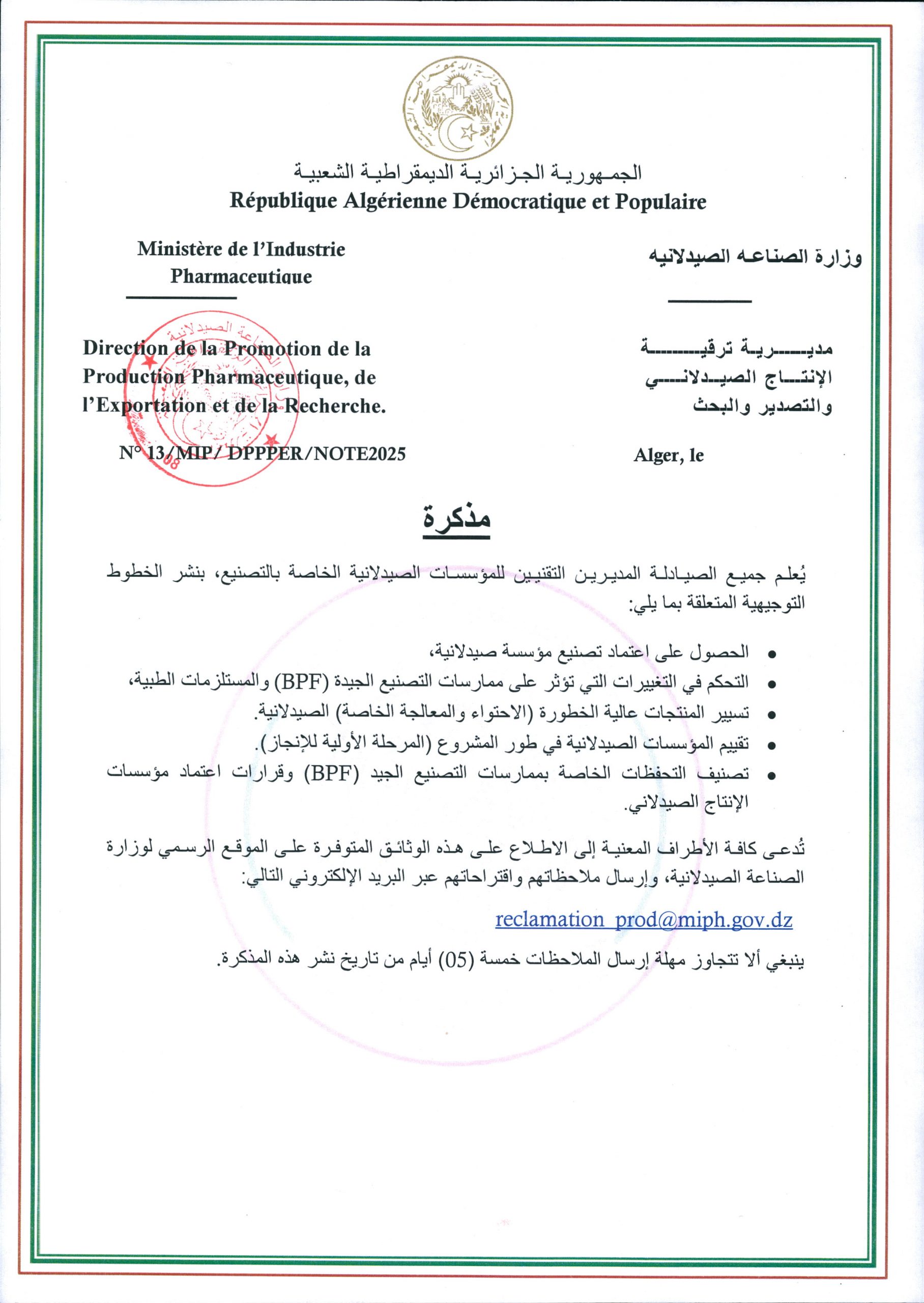 تعليمة موجهة للمؤسسات الصيدلانية للتصنيع
