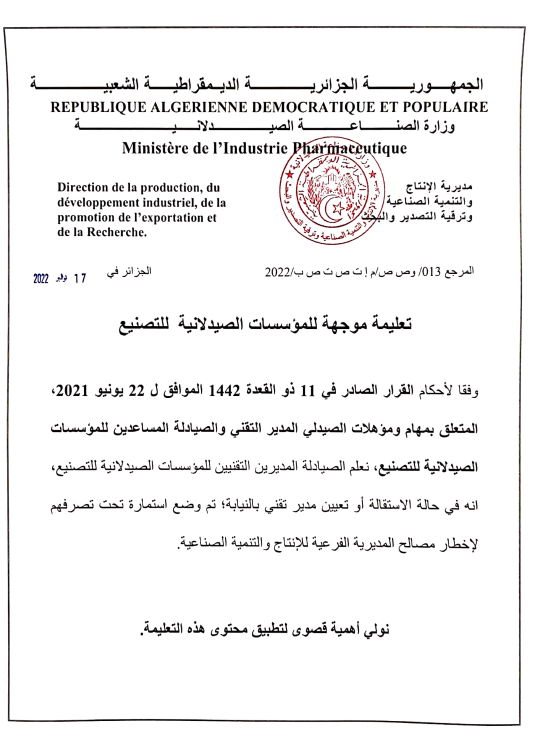 • تعليمة موجهة للمؤسسات الصيدلانية للتصنيع