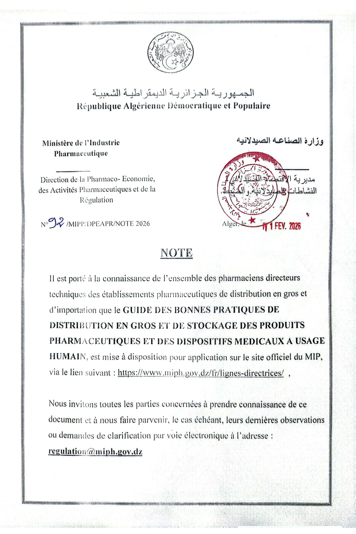 - البريد الالكتروني: regulation@miph.gov.dz