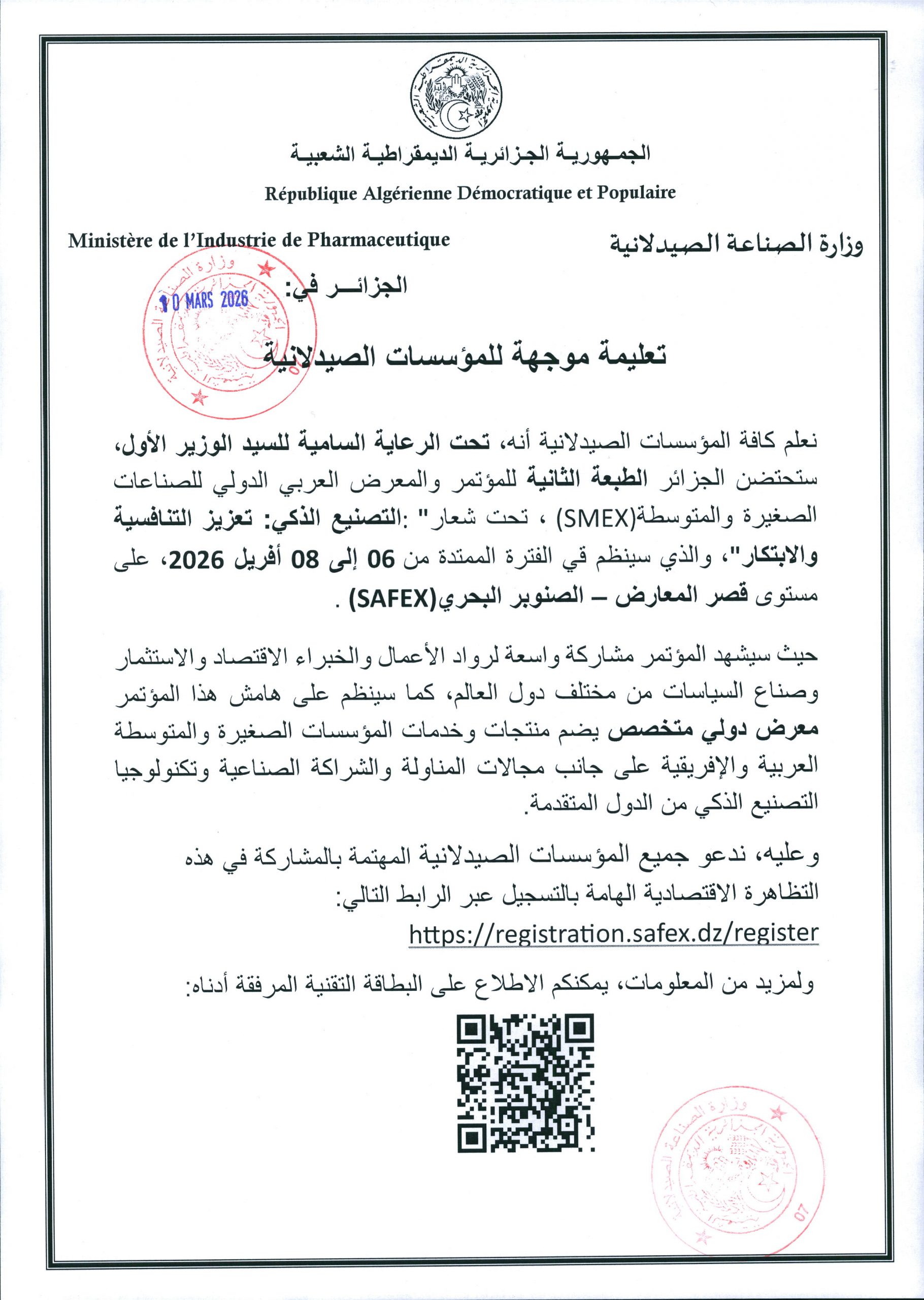البريد الالكتروني: Event@safex.dz / Smex2026@mcepe.gov.dz