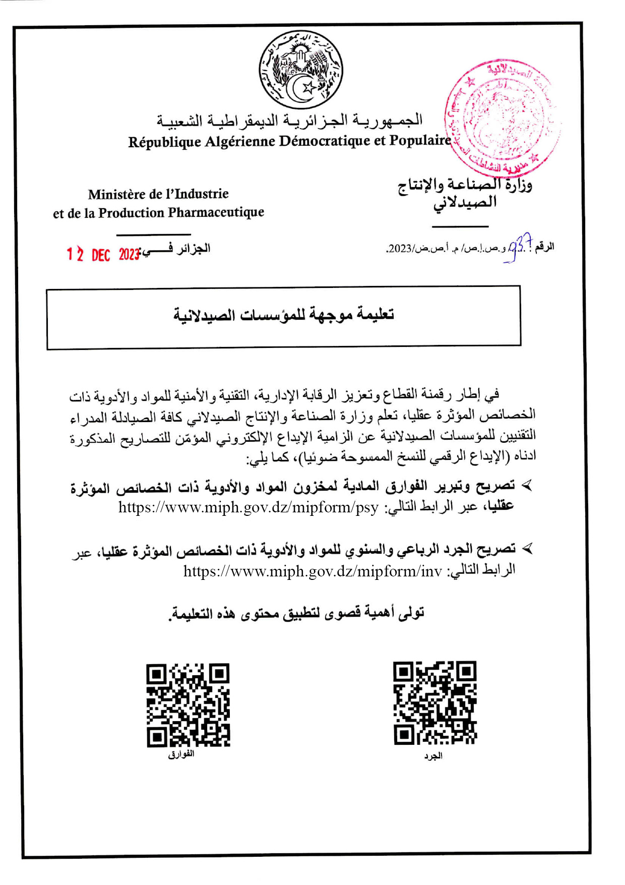 تعليمة موجهة للمؤسسات الصيدلانية ghorab 13 ديسمبر 2023 No comments تصريح وتبرير الفوارق المادية لمخزون المواد والأدوية ذات الخصائص المؤثرة عقليا تصريح الجرد الرباعي والسنوي للمواد والأدوية ذات الخصائص المؤثرة عقليا