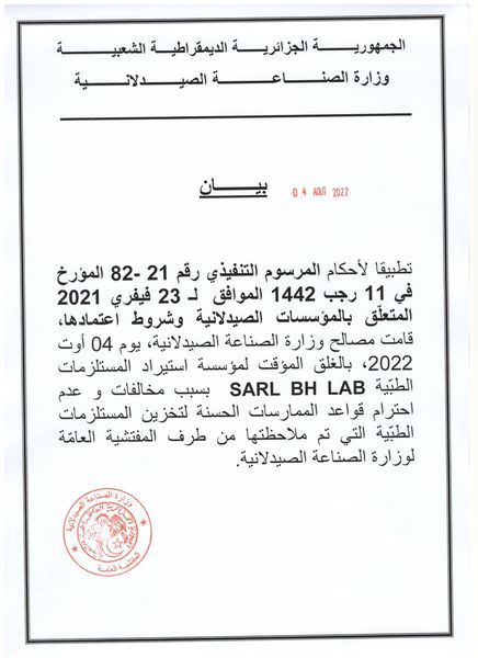 غلق المؤقت لمؤسسة استيراد المستلزمات الطبّية SARL BH LAB