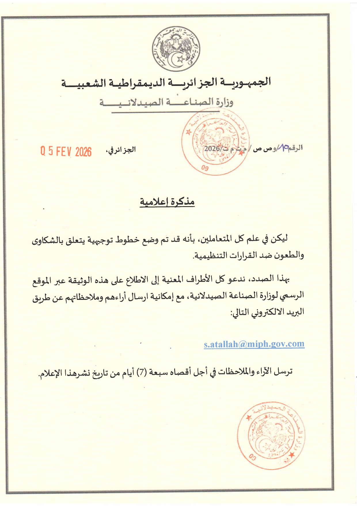 - البريد الالكتروني: s.atallah@miph.gov.dz