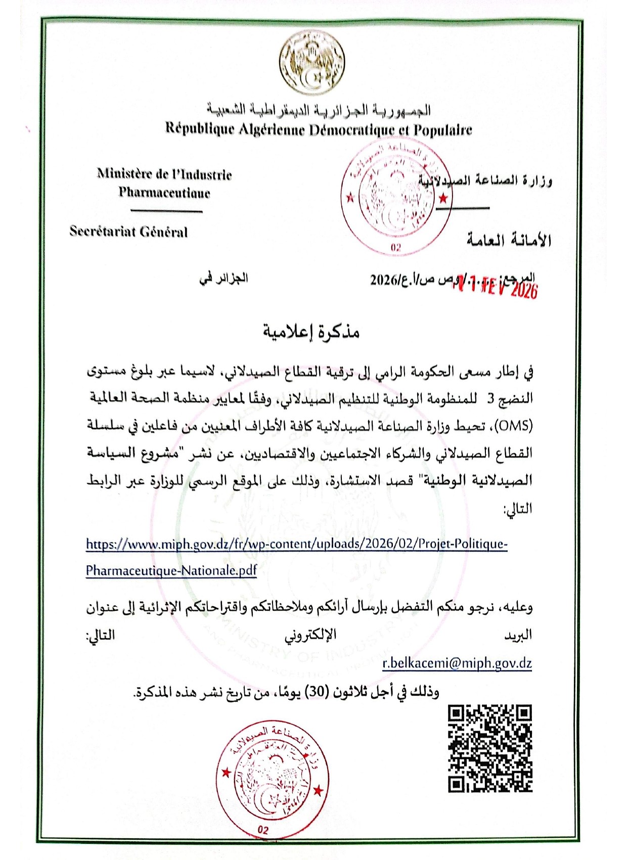• تعليمة موجهة للمؤسسات الصيدلانية للتصنيع