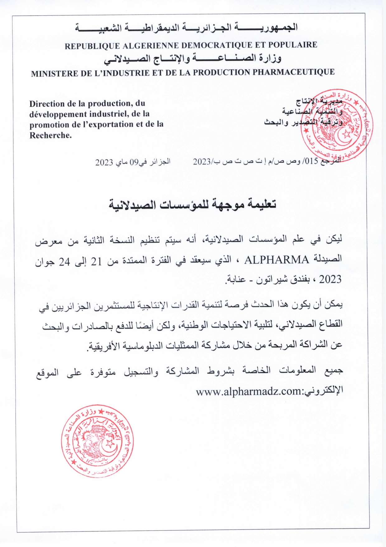 تعليمة موجهة للمؤسسات الصيدلانية- الطبعة الثانية لمعرض الصيدلية “ALPHARMA” ghorab 9 مايو 2023 No comments www.alpharmadz.com
