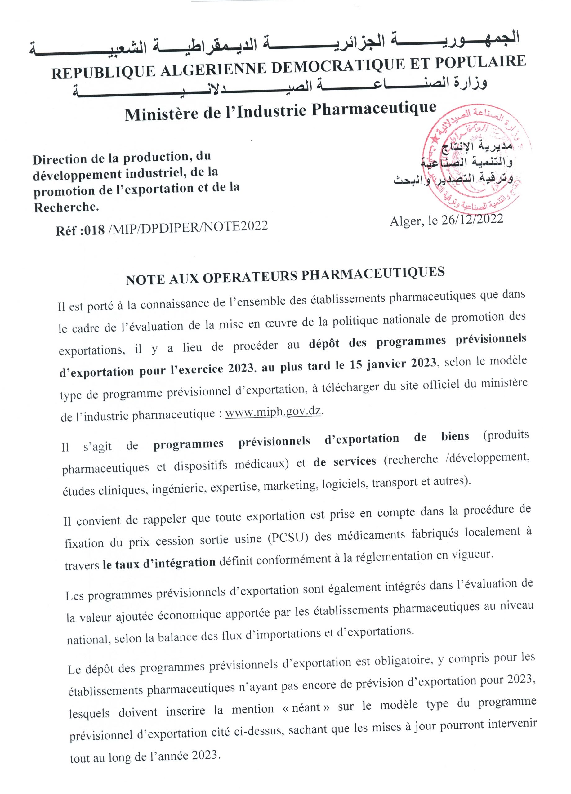 • NOTE AUX OPÉRATEURS PHARMACEUTIQUES RELATIVE AUX PROGRAMMES PRÉVISIONNELS D’IMPORTATION – EXERCICE 2026