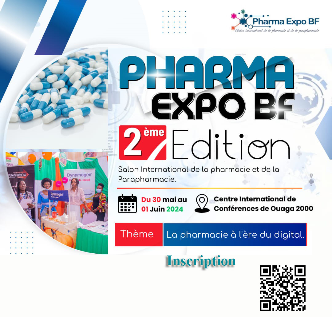 Deuxième édition du salon de la pharmacie et de la parapharmacie intitulée « Pharma Expo BF », prévue pour la période du 30 mai au 1er juin 2024, à Ouagadougou (BURKINA FASO), sous le thème « La Pharmacie à l’ère du Digital ».
