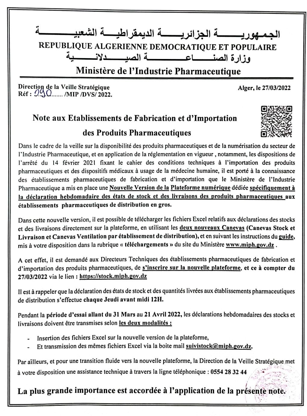 Email: suivistock@miph.gov.dz