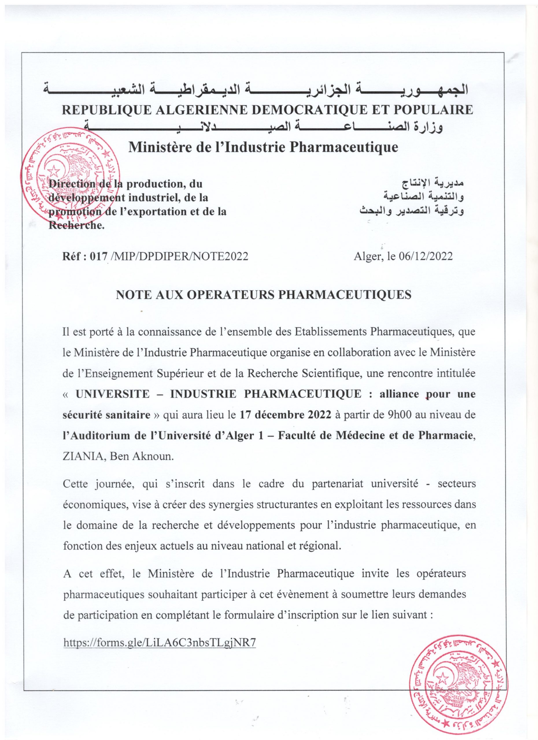 • Note aux opérateurs pharmaceutiques