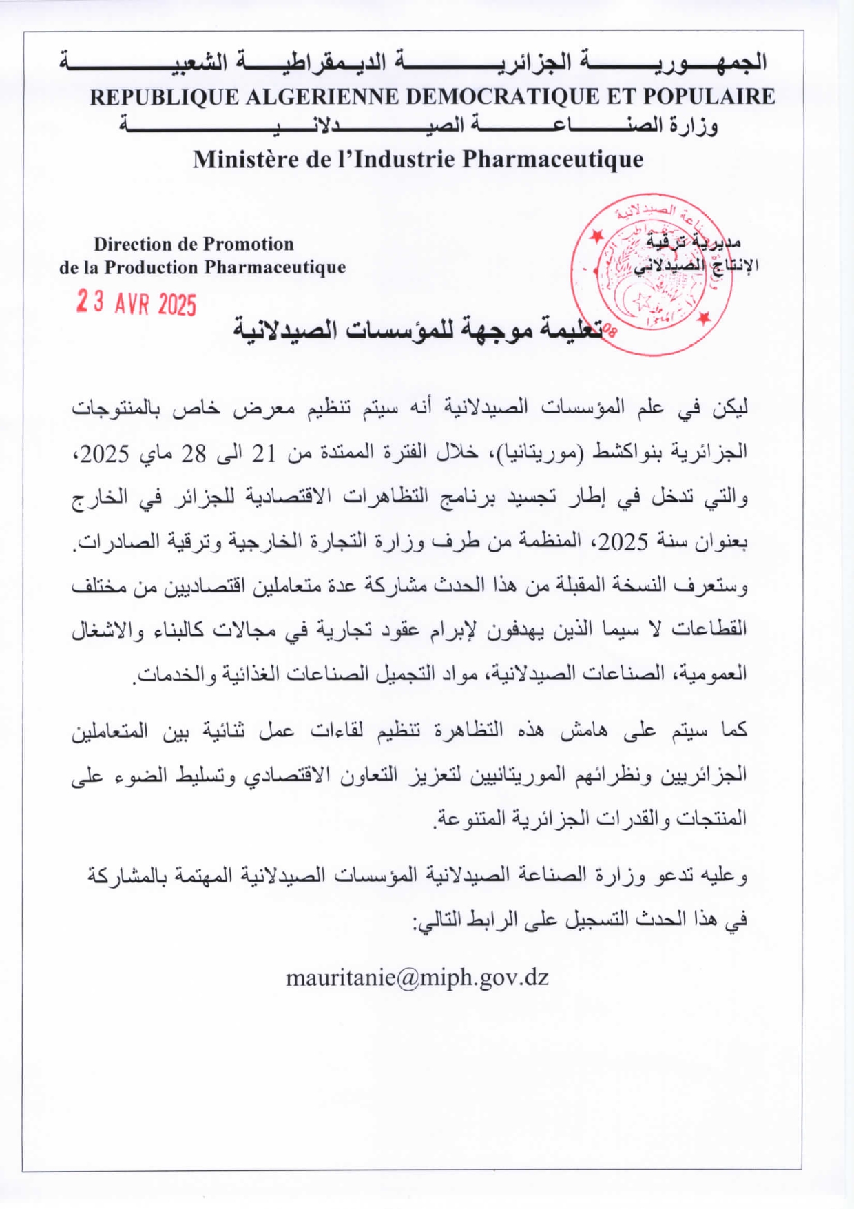 Email: mauritanie@miph.gov.dz