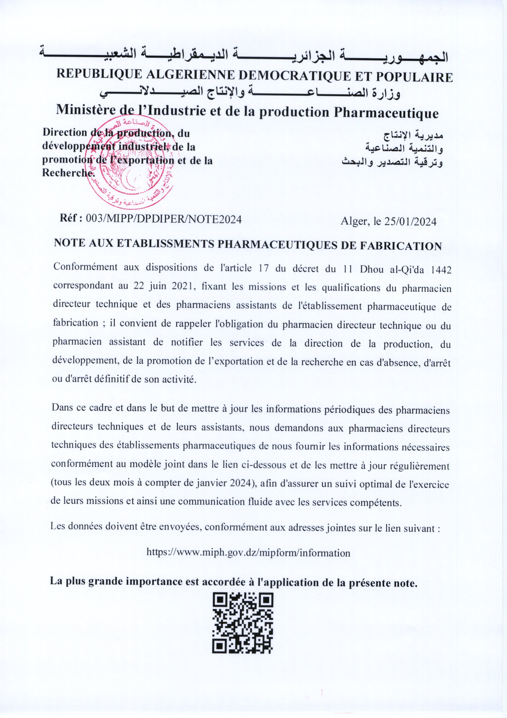 Note aux établissements pharmaceutiques de fabrication