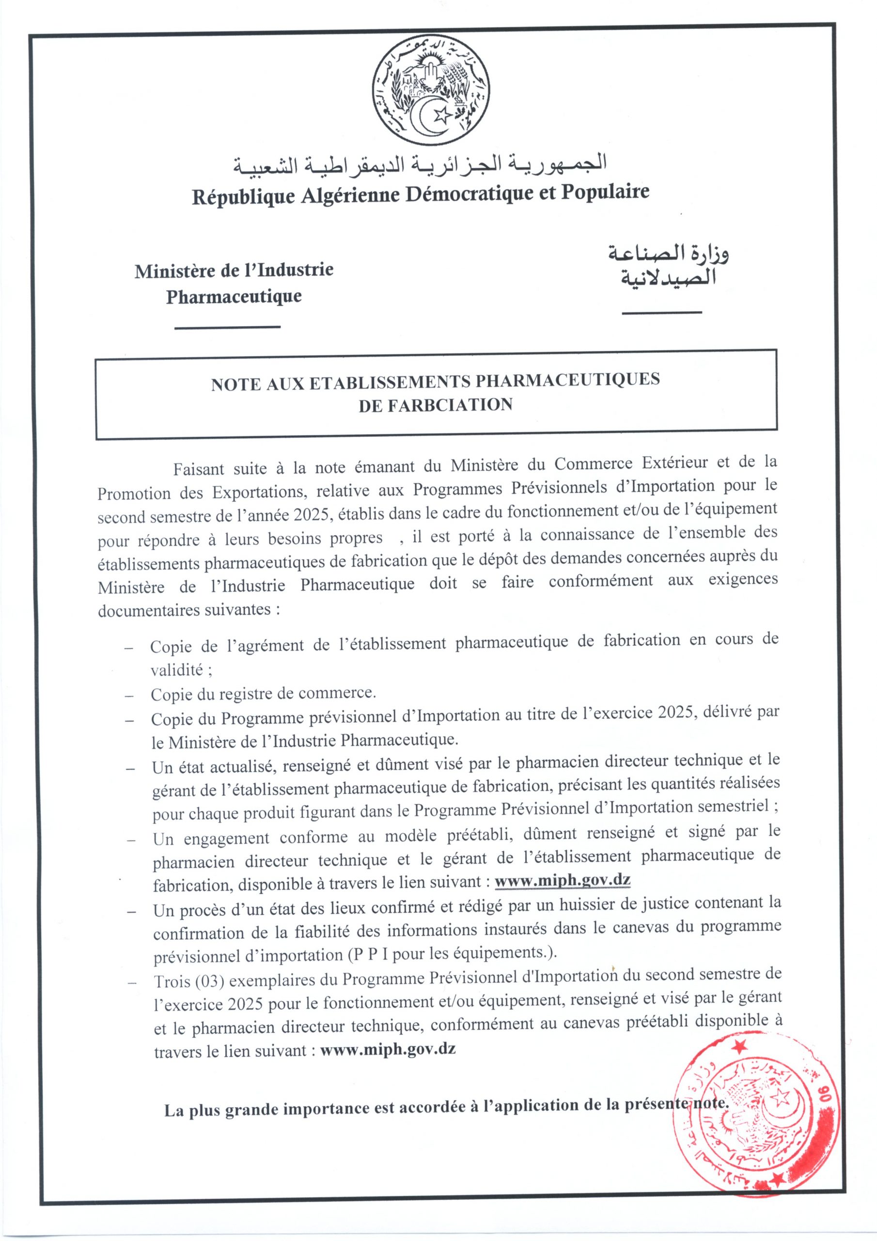 • NOTE AUX OPÉRATEURS PHARMACEUTIQUES RELATIVE AUX PROGRAMMES PRÉVISIONNELS D’IMPORTATION – EXERCICE 2026