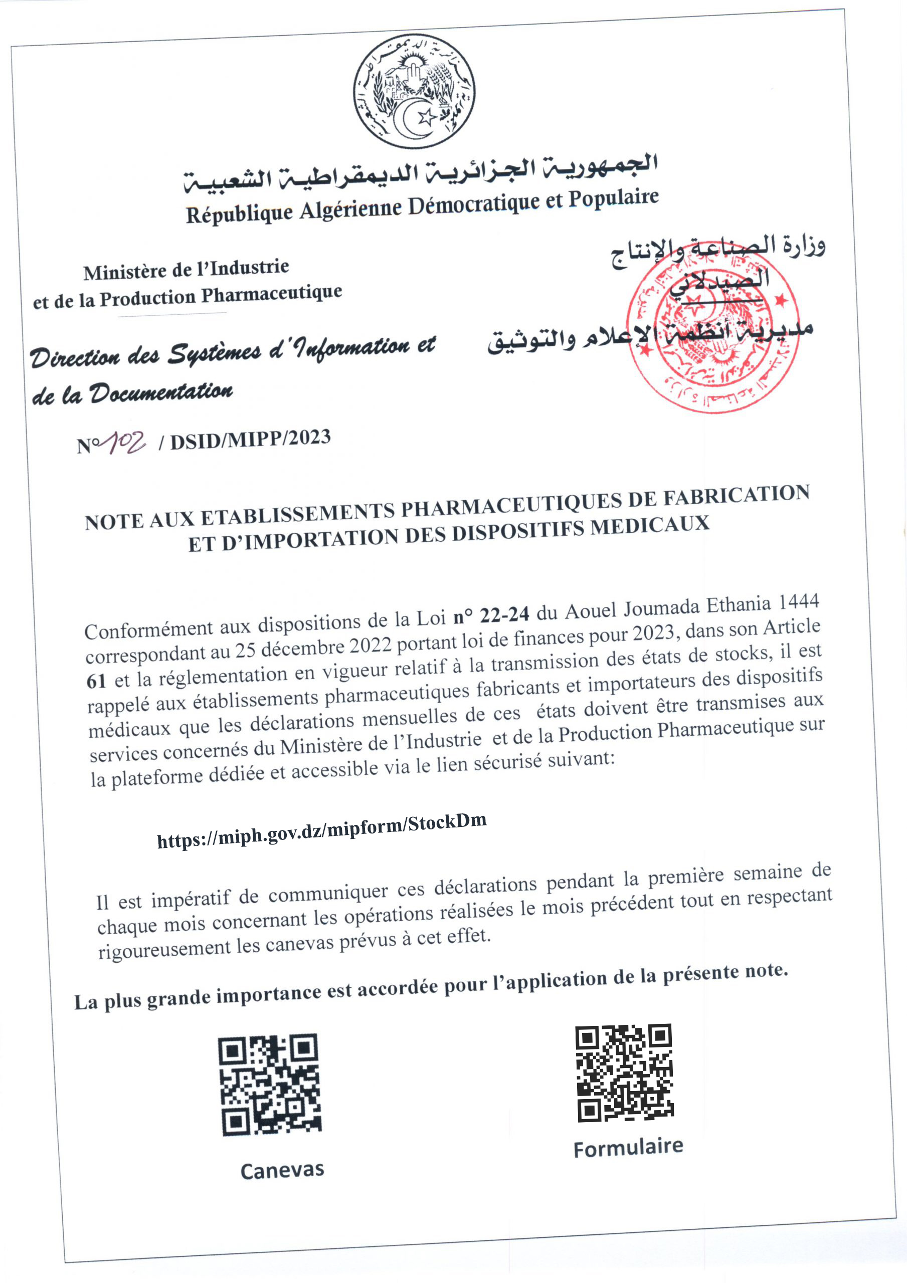 NOTE AUX ETABLISSEMENTS PHARMACEUTIQUES DE FABRICATION ET D’IMPORTATION DES DISPOSITIFS MEDICAUX