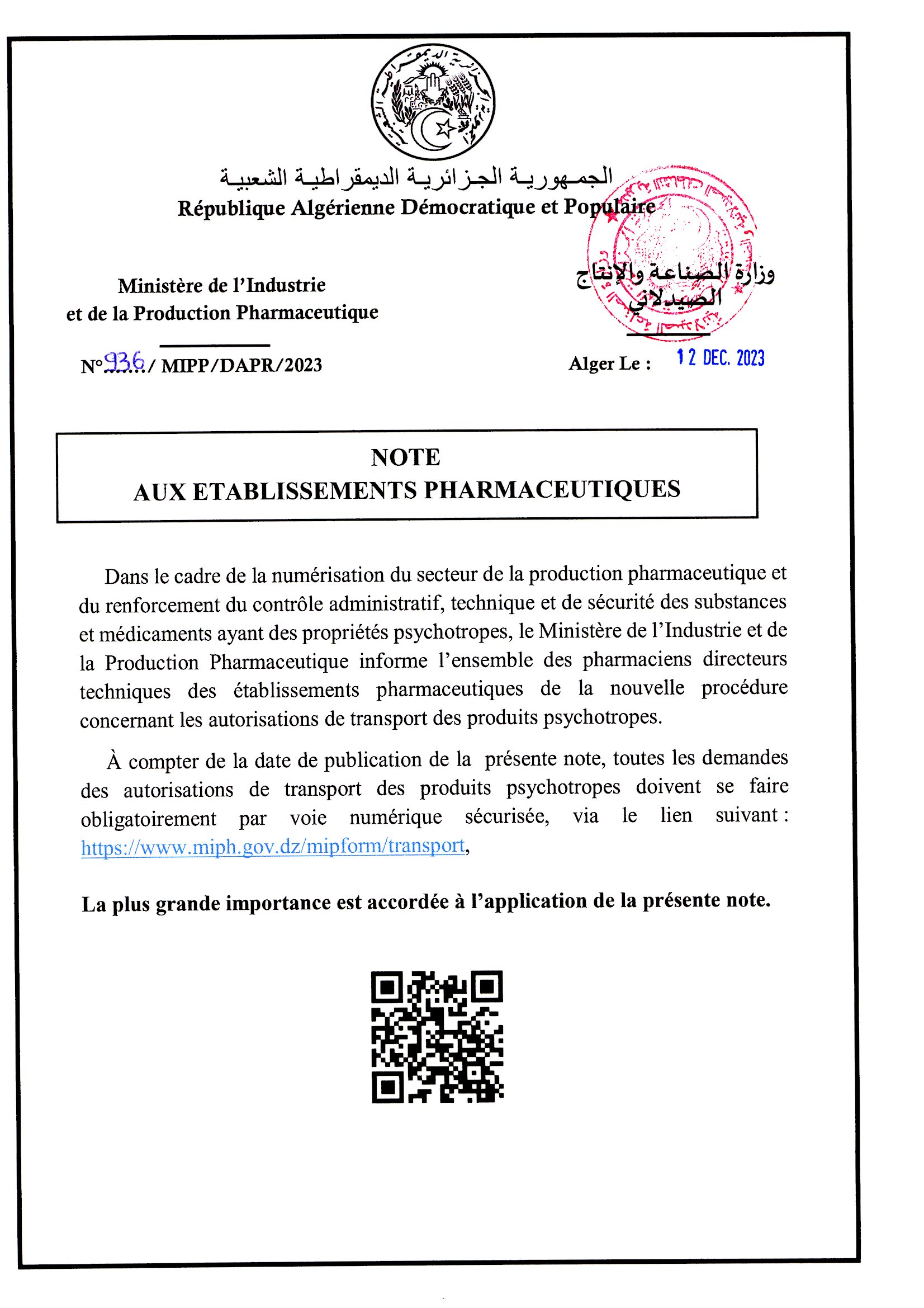 NOTE AUX ETABLISSEMENTS PHARMACEUTIQUES- Transport des psychotropes