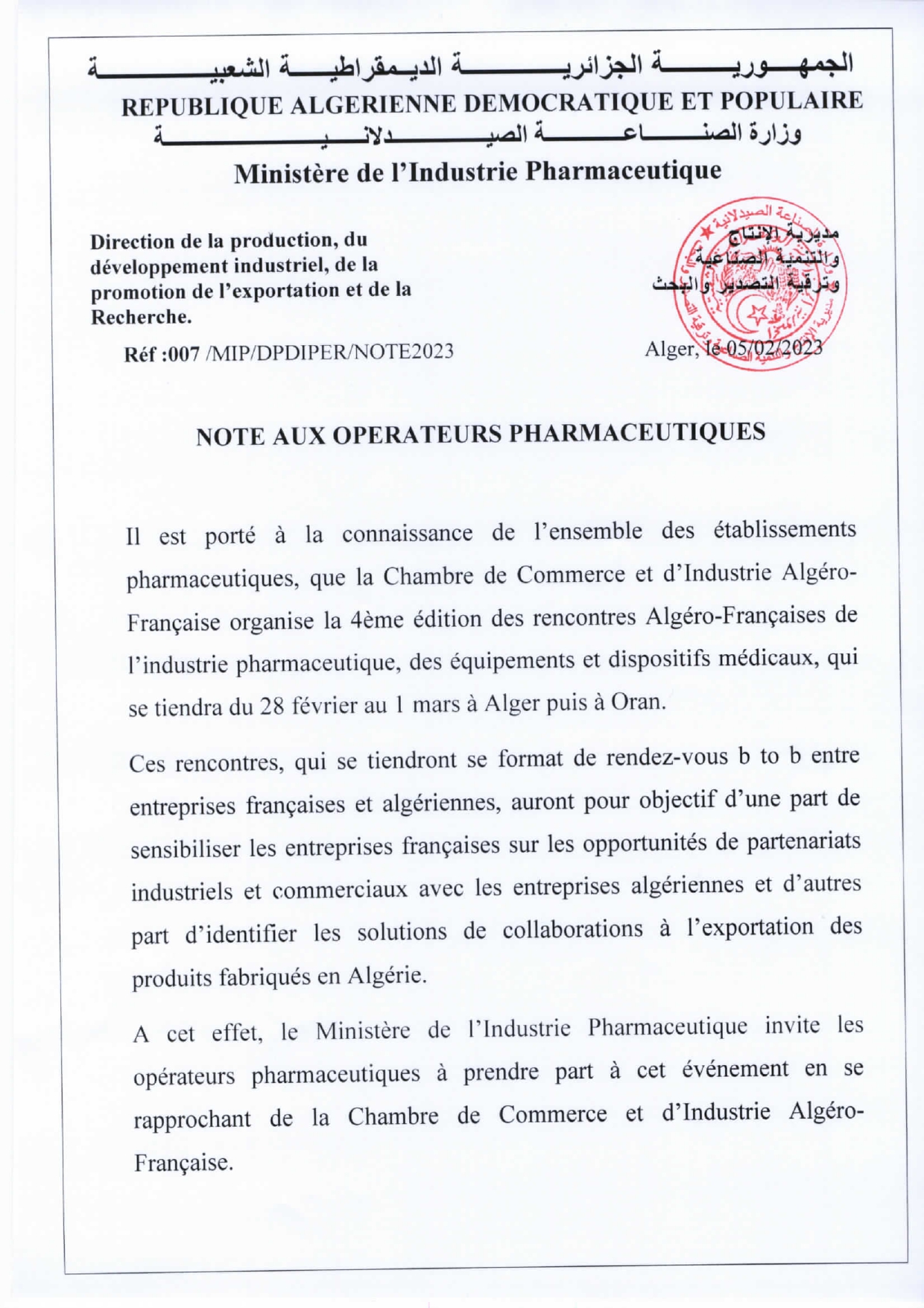 Note aux opérateurs pharmaceutique – 4ème édition des rencontres Algéro-Françaises