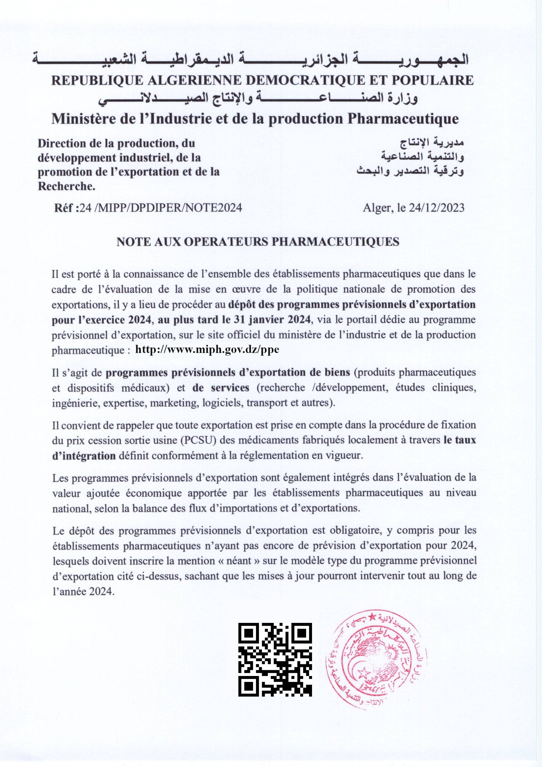 Note aux opérateurs pharmaceutique – programmes prévisionnels d’exportation – exercice 2024