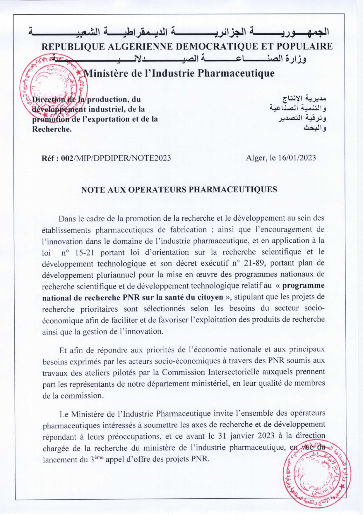 Note aux opérateurs pharmaceutiques- 3ème appel d’offre des projets PNR