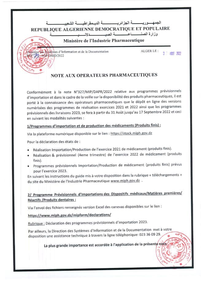 • NOTE AUX OPÉRATEURS PHARMACEUTIQUES RELATIVE AUX PROGRAMMES PRÉVISIONNELS D’IMPORTATION – EXERCICE 2026
