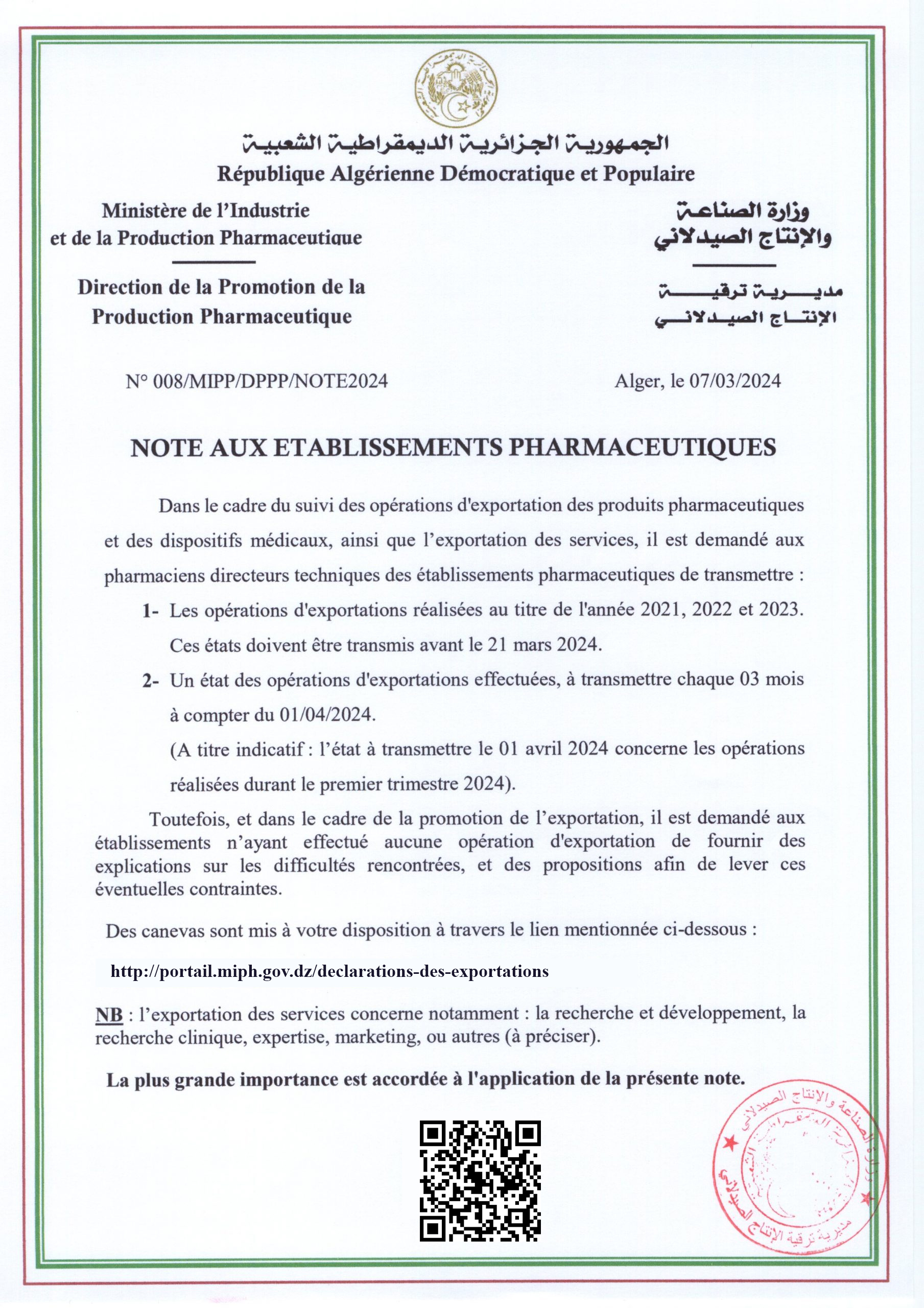 • Note aux opérateurs pharmaceutiques