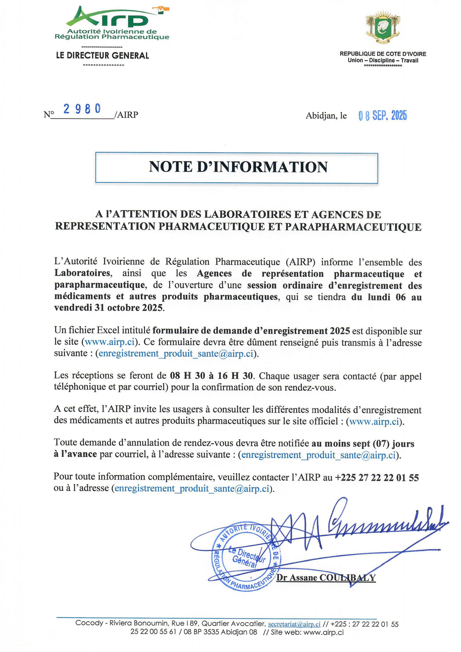 Adresse Email: enregistrement_produit_sante@airp.ci