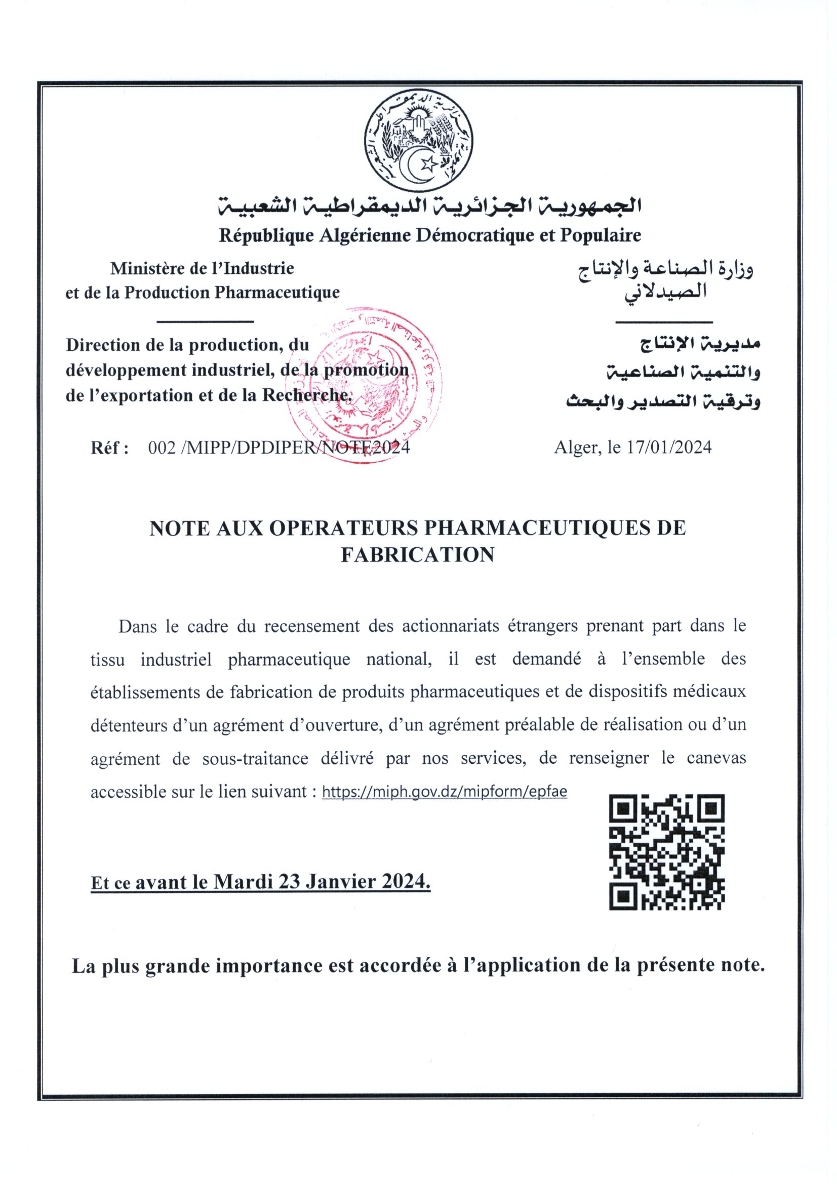 • Note aux opérateurs pharmaceutiques