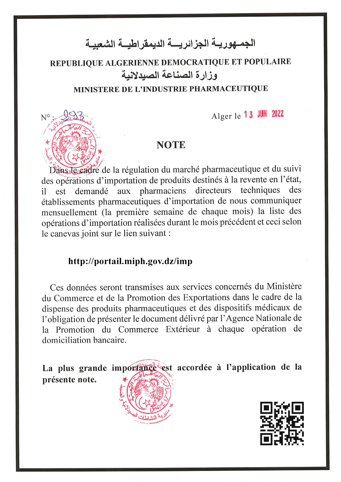 Note aux opérateurs pharmaceutiques-liste des opérations d’importation