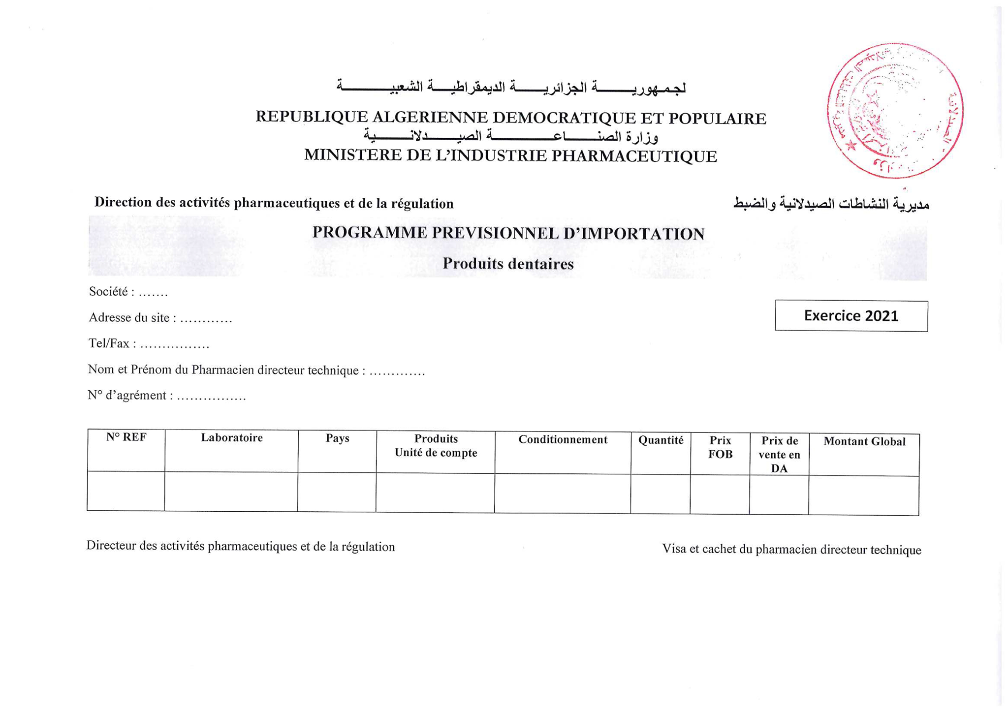 Programme prévisionnel d’importation produit dentaire