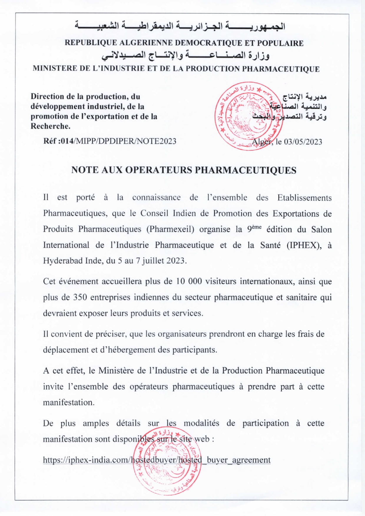 Note aux opérateurs pharmaceutiques -9 ème edition du Salon International de l’Industrie Pharmaceutique et de la Santé -IPHEX