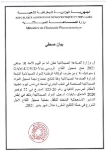 En effet, le ministère de l’Industrie pharmaceutique « annonce qu’aujourd’hui, dimanche 10 janvier 2021, l’enregistrement du vaccin russe GAM-COVID-Vac (Sputnik-V) a été accordé par l’Agence nationale des produits pharmaceutiques du ministère de l’Industrie pharmaceutique, selon les résultats de la réunion du Comité d’enregistrement des produits pharmaceutiques utilisées en médecine humaine, en application des dispositions du décret exécutif n ° 20-325 du 22 novembre 2020 relatif aux modalités d’enregistrement des produits  pharmaceutiques, dans le cadre des mesures urgentes prises pour assurer le processus d’enregistrement du vaccin afin de démarrer la campagne de vaccination prévue courant janvier 2021, précise la même source.