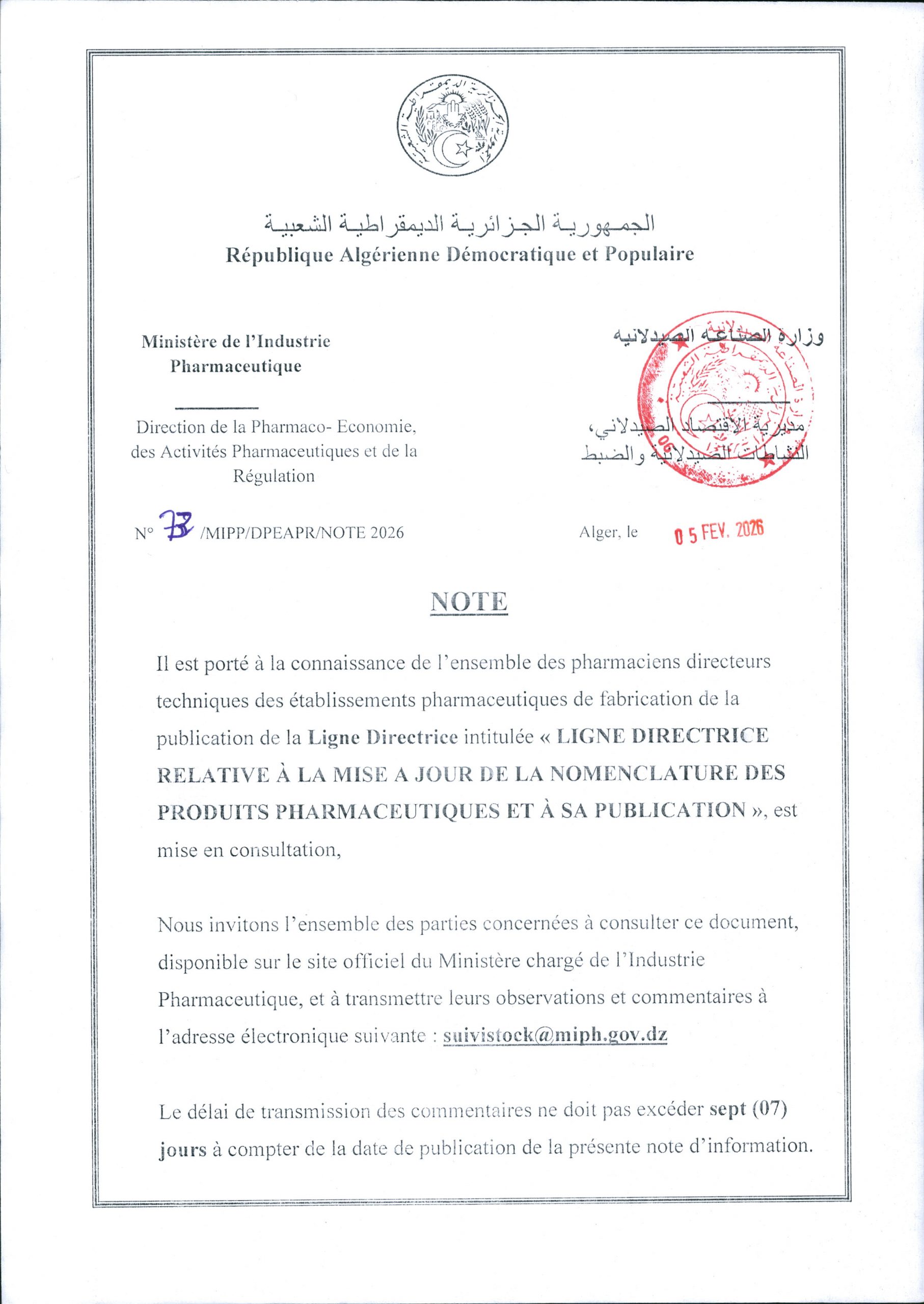 - Email: suivistock@miph.gov.dz