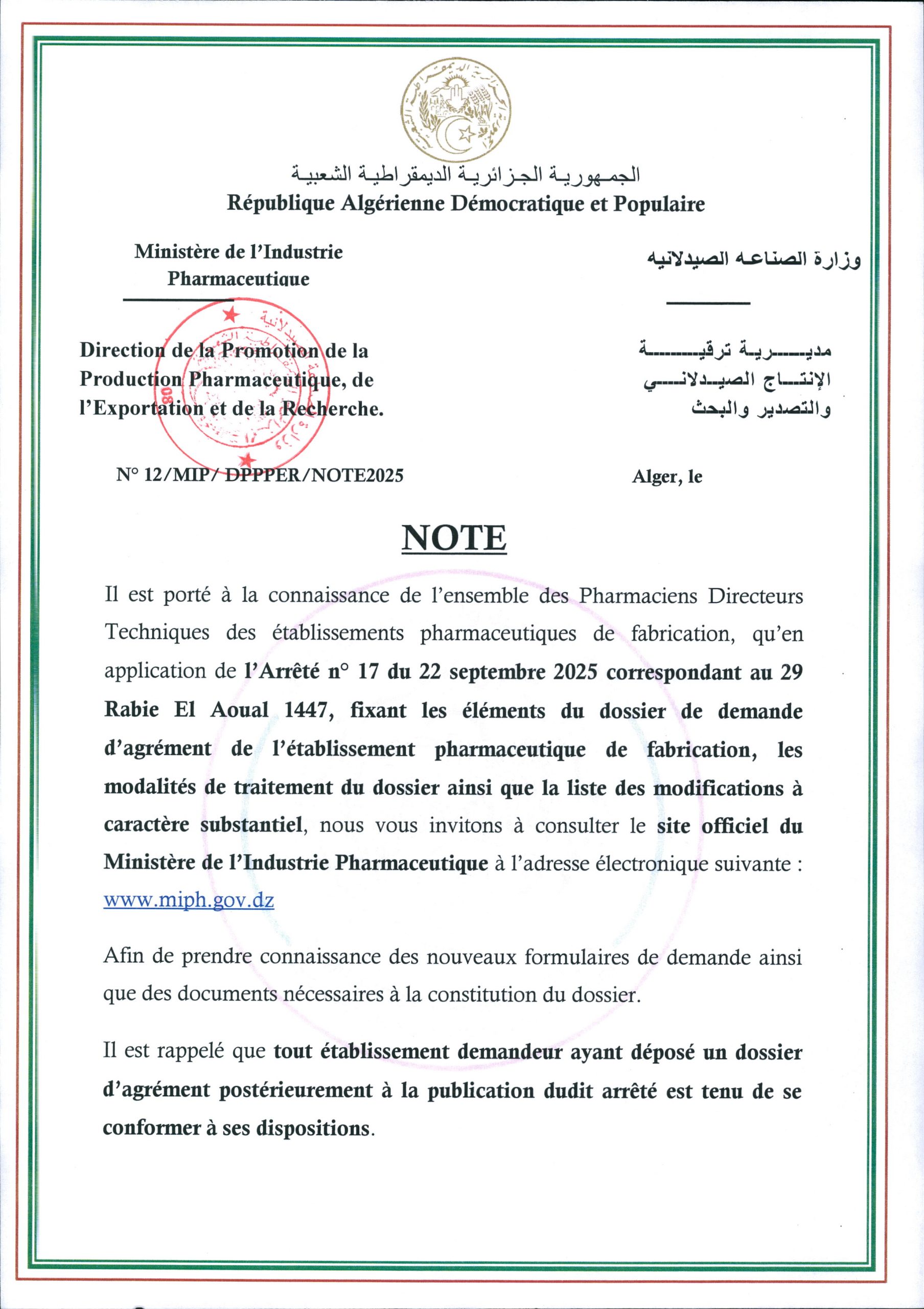 Note aux établissements pharmaceutiques de fabrication