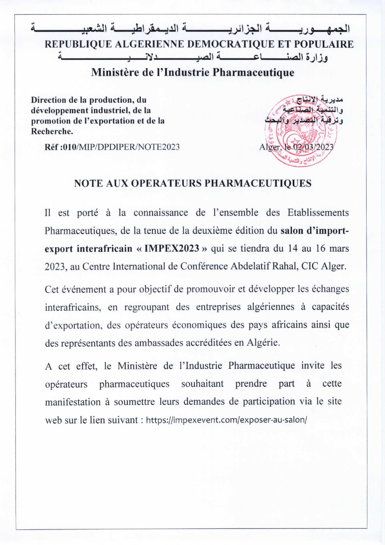 Note aux établissements pharmaceutiques – EMPEX2023