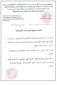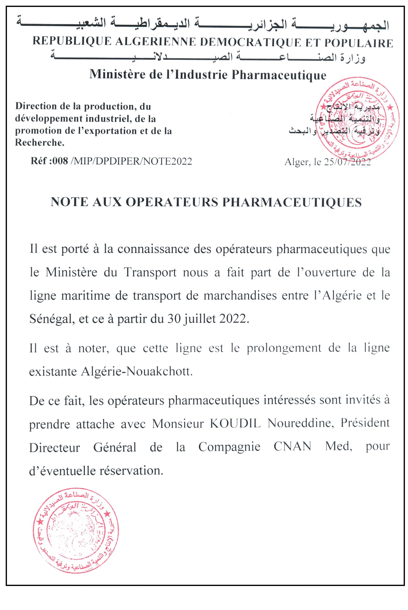 Note aux opérateurs pharmaceutiques-Ouverture de la ligne maritime de transport des marchandises entre l’Algérie et le Sénégal