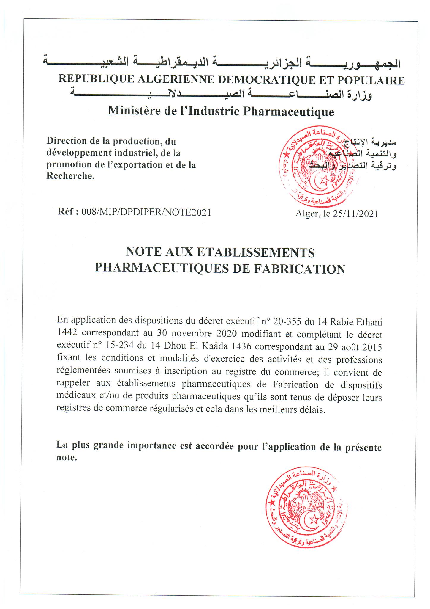 Note aux etablissements pharmaceutiques de fabrication
