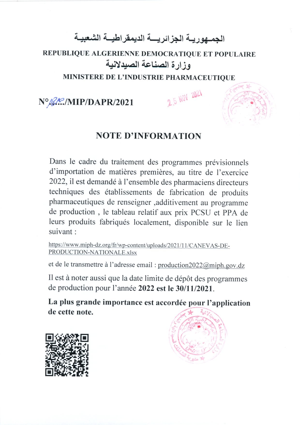 Email: production2022@miph.gov.dz