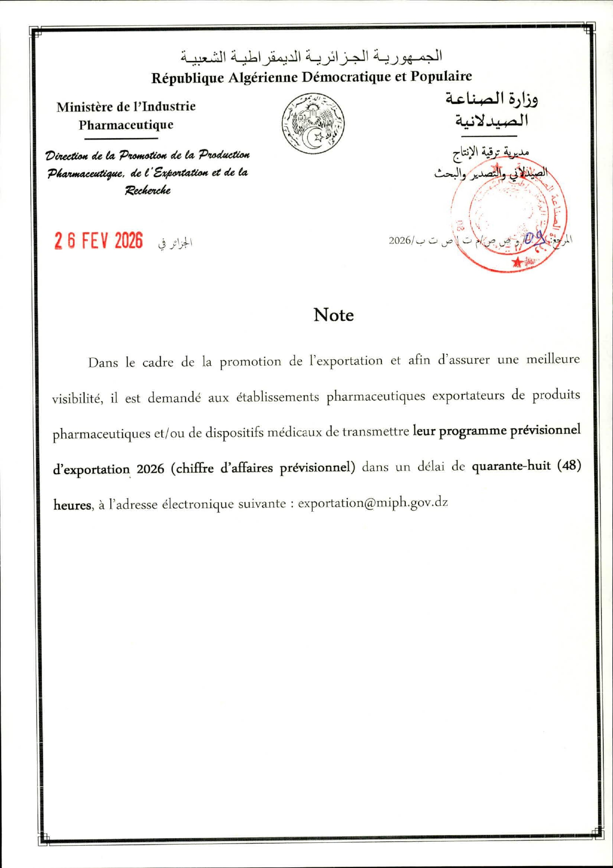 Email: exportation@miph.gov.dz